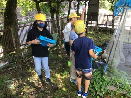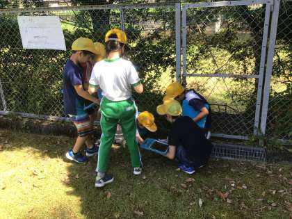 理科の学習で1時間目の気温が上がりきらない時間に夏の生物を探しています。運動場周辺だけでもトンボや蝶、バッタなど昆虫を中心に熱心に観察していました。