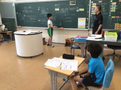 算数科の大きな数の学習です。計算の仕方について黒板の前に出て説明していました。0がたくさん出てくるので、頭を悩ませながら考えていました。