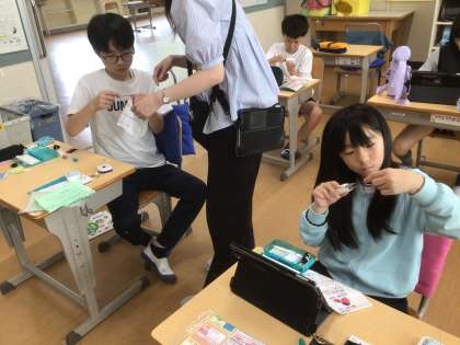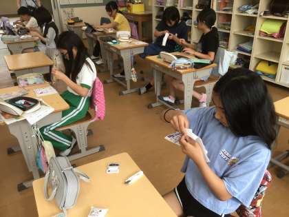 家庭科の時間です。玉結びと玉止めの練習をしていました。うまくできている子もいれば、「どうやってやるの?」と何度もチャレンジしている子もいました。
