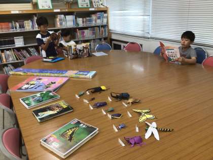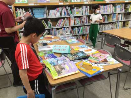 図書室で夏休み中に読む本を決めていました。休み中も借りることができる期間があるので、どんどん利用してください。