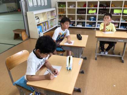 読書感想画を制作する学習です。「マーヤのさるたいじ」というお話だそうです。この時間は、どんな場面をどのように書いたらいいのかについて話し合っていました。