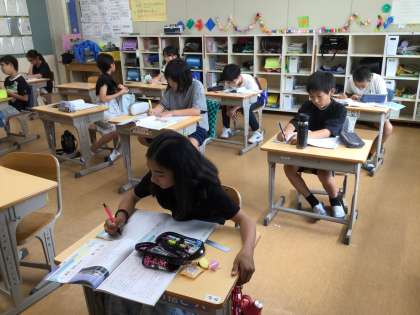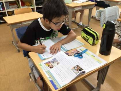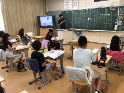 道徳科の時間です。「真由、班長になる」という題名で、集団生活の充実やよりよい学校生活について考えるものです。後半に行ったので黒板にはたくさんの意見が出ていました。もうすぐ林間学校です。気持ちのよい集団生活にしていきたいですね。
