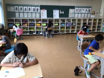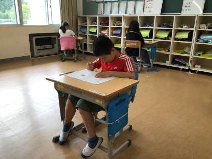 国語のテストの最中でした。机の位置を移動して真剣に取り組んでいました。