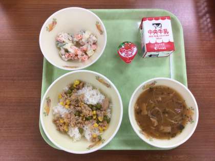 ツナそぼろ丼 じゃがいもと大豆のサラダ みそ汁(備蓄用)プチゼリー(アセロラ)