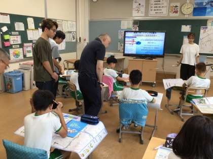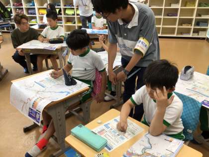 社会科の出前講座として、防災課の方と愛知工業大学の学生さんにお越しいただきました。ハザードマップを見て、自宅付近がどのような場所なのか、避難のタイミングは等、防災について考えました。