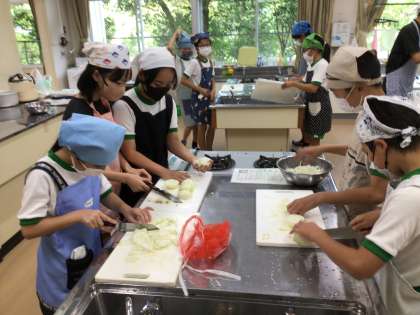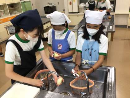 カレーライスの調理実習です。来週の林間学校の夕食メニューにもなっているので、その練習も兼ねています。包丁を上手に使っている子がいました。