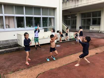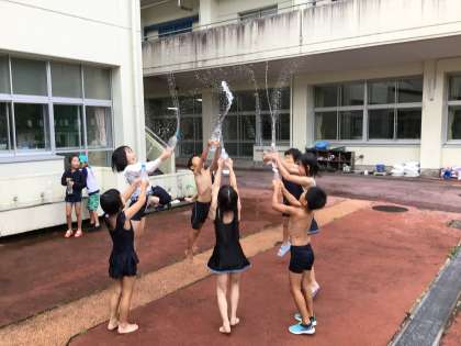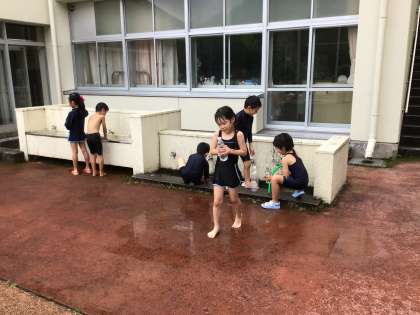 生活科で水遊びをしました。気温が高くなる前だったので、どうかと思いましたが、全く関係ないという様子で大いに楽しんでいました。