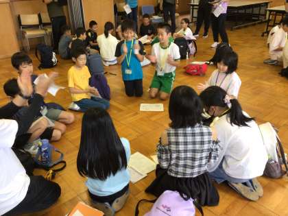 5年生の林間学校が始まりました。旭高原自然の家で小渡小、敷島小との3校合同での行事です。入所式を終え、出会いの会をしています。