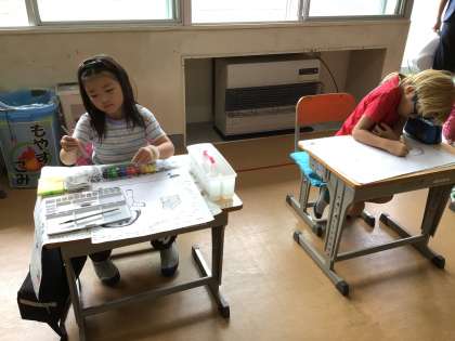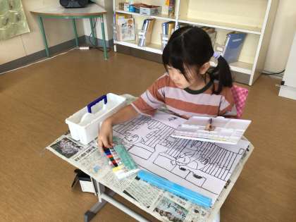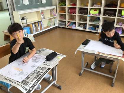 図画工作科の時間です。読書感想画を描いています。心に残った場面を詳しく絵に表していました。