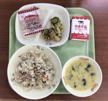 今日の給食は、ごぼうをたっぷり使ったきんぴらピラフです。