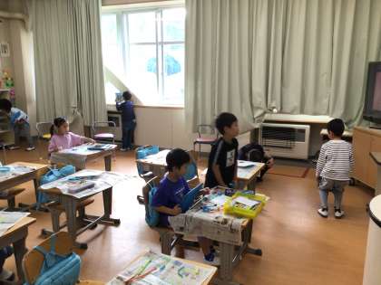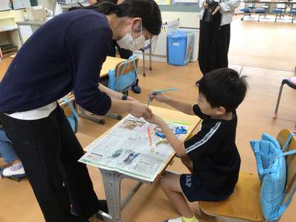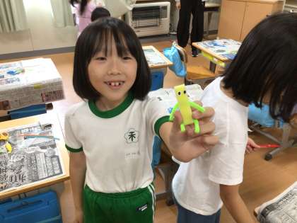 図画工作科の研究授業の様子です。「すきまちゃんの すきな すきま」の学習です。教室の中でいろんなすきまを見つけて、自作のすきまちゃんを置きました。
