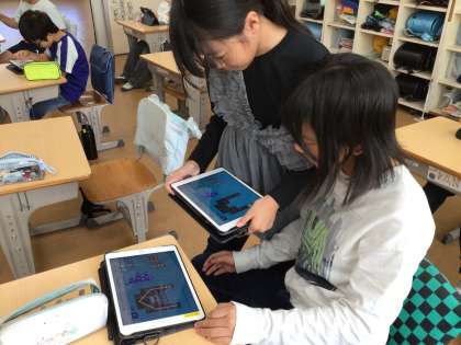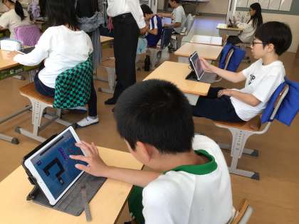 ICT支援員の先生に教えていただきました。アルゴロジックというソフトでプログラミング学習をしました。やや難しそうに操作していました。