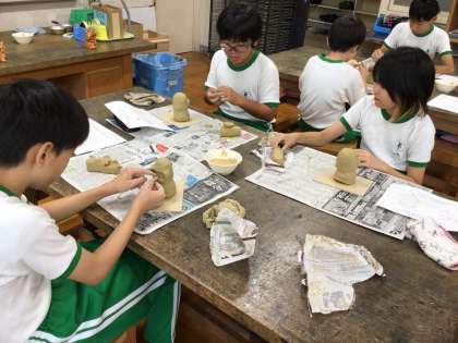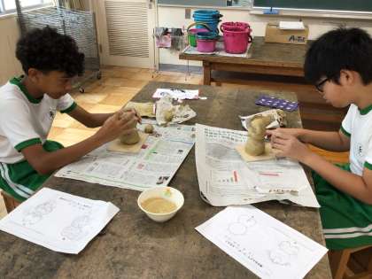 図画工作科の学習で焼き物体験に取り組んでいます。粘土の感触を味わいながら福を呼ぶシーサーを創作しています。