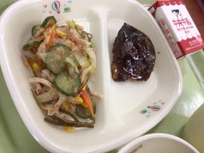 今日の給食は、1年生の国語の時間に勉強する、「サラダでげんき」にでりっちゃんがお母さんのために作るサラダを再現したメニューです。