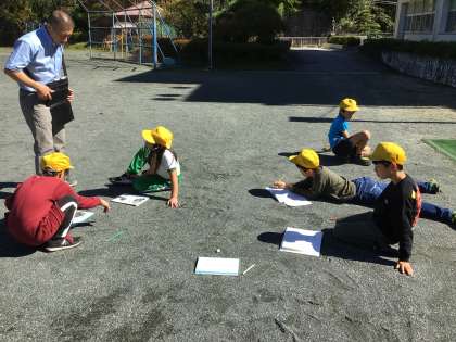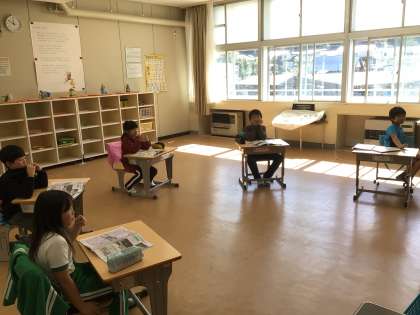 理科の学習です。日なたと日かげの違いについて意見を出し合ったあと、実際に外へ出て調べていました。