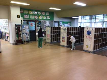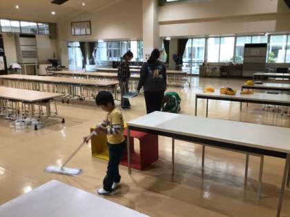 給食後の掃除の時間の様子です。担当場所を少ない人数でしっかりと清掃しています。掃除は月・水・金の週3日行っています。