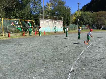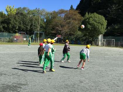 休み時間の様子です。ブランコ、バレーボール、サッカーを楽しむ子どもたちの明るい声が運動場に響いていました。