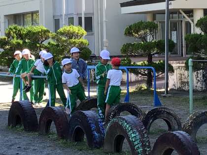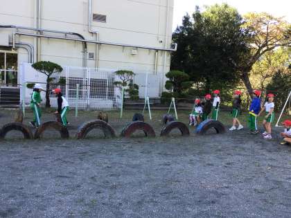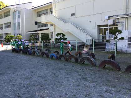 体育の授業の様子です。タイヤを使ってジヤンケンゲームを楽しみました。