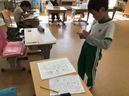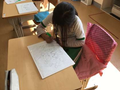 図画工作科の時間です。書いた絵を版画板に写す作業をしています。ペン先のようなものでキズをつけるように写していくので、力の加減にも気を遣っていました。