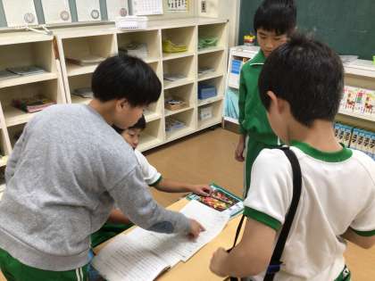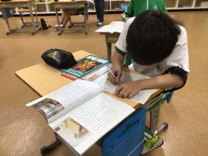 国語科の時間です。説明文をまとまりのある段落に分ける学習をしています。友だちとも相談しながら進めていました。