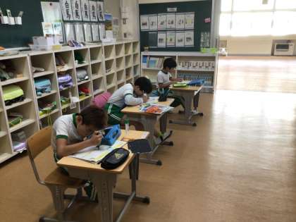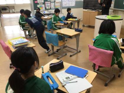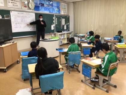 社会科の時間です。稲武小学校の歴史について学んでいました。1872年の明月清風校の名前もあげられており、児童は興味津々の様子でした。