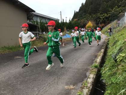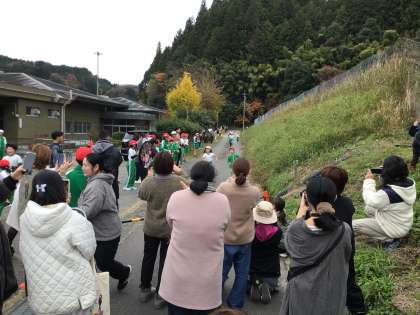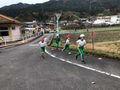 続いて1・2年生です。コースを2周の1200Mです。こども園の園児さんにも応援してもらいながらしっかり走り切りました。