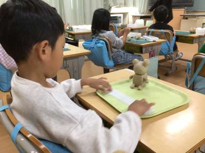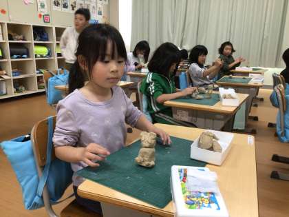 図画工作科の時間です。粘土を使って好きな動物を作っています。パンダ、ペンギン、マッコウクジラなどさまざまな動物を上手に作っていました。