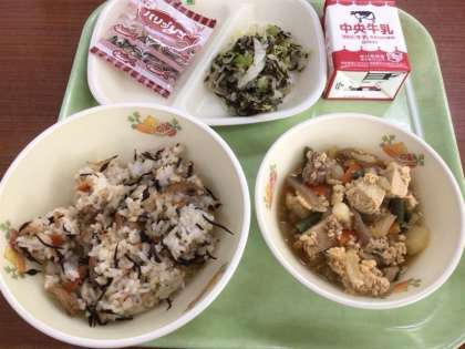 混ぜごはんの「ひじき」「干しエビ」、煮物の「高野豆腐」、乾燥小魚にカルシウムが多く含まれています!