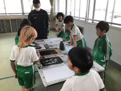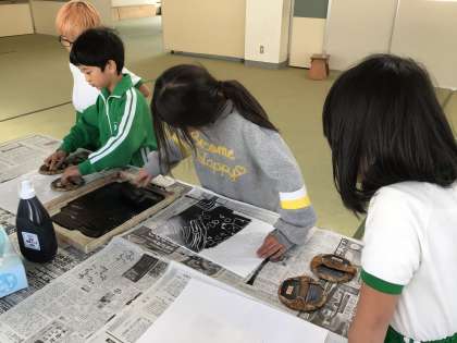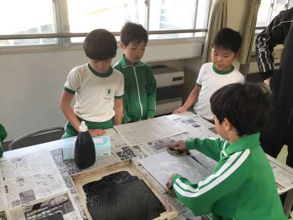 図画工作科の時間です。いよいよ制作していた版画の印刷の段階に入っていました。インクの量やばれんのこすり具合などを確かめながら印刷していました。
