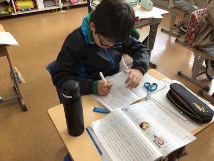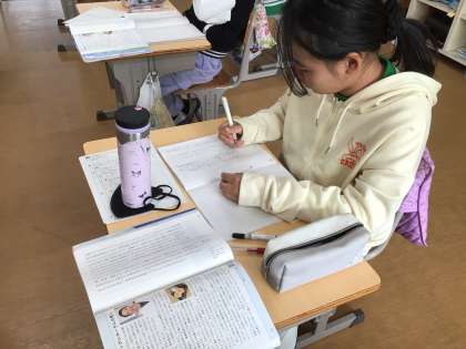 国語科の時間です。筆者の考えをまとめて、インタビュー記事との関係をとらえるという課題での学習です。ノートに黙々と書き込んでいました。