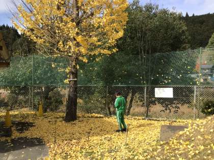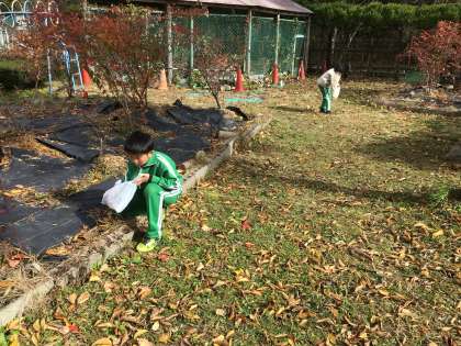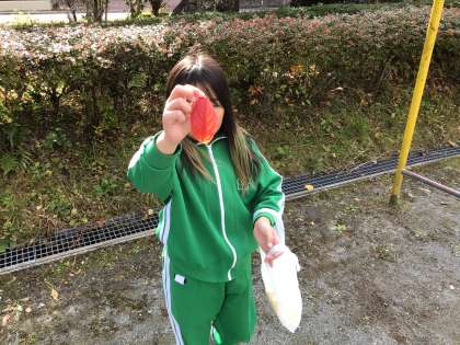 運動場にいたので理科の時間かと思いましたが違いました。葉っぱを使った絵を描くために、葉っぱを集めているところでした。