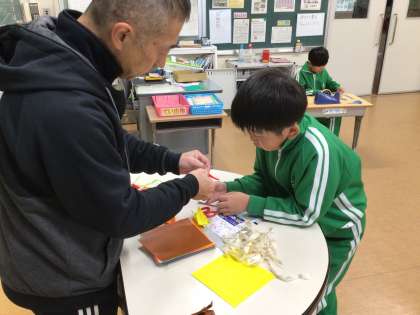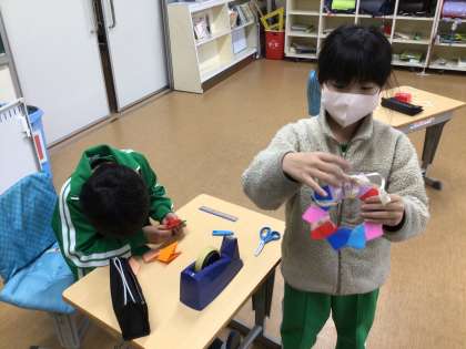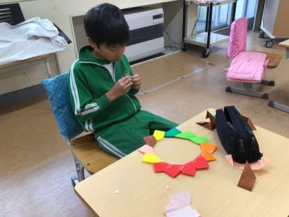 図画工作科の時間です。クリスマスリース作りをしていました。折り紙を使ったリースのようで、いくつかの部品を組み合わせるようなかたちで作成していました。