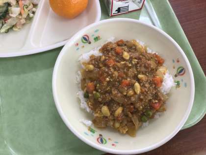 今日の給食は、豆腐と大豆を使ったキーマカレーです。