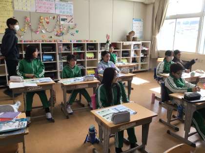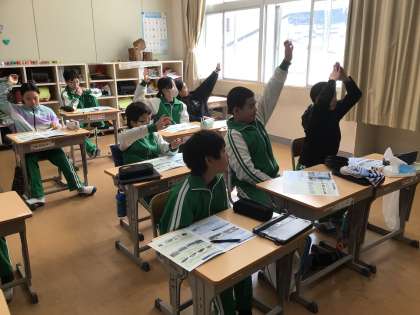 社会科の時間です。トヨタ自動車のオンライン授業を受けています。車づくりの仕組みや工夫を知り、日本の自動車づくりのよさに気づくことができました。