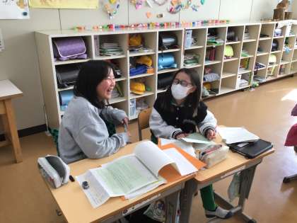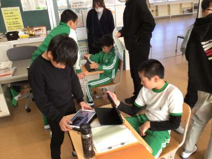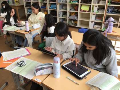総合的な学習の時間です。今までやってきた森林学習についてグループでまとめをしています。わかりやすく発表するために工夫をしながら進めていました。