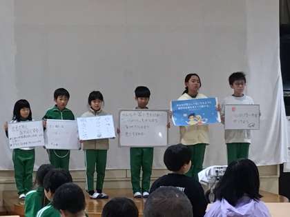 学年ごとに、自分たちで考えた目標を発表しました。一人一人が、「友達や周りの人」を「自分」と同じように大切にしていくことについて考えました。