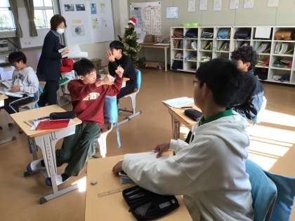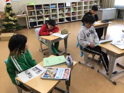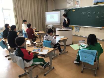 外国語科の時間です。聞き取りの学習をしていました。初めて習う単語もいくつかあるので、それを学んでから、聞いた英語の文章に関する問題に答えていました。