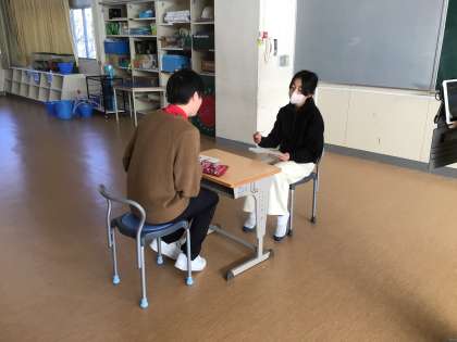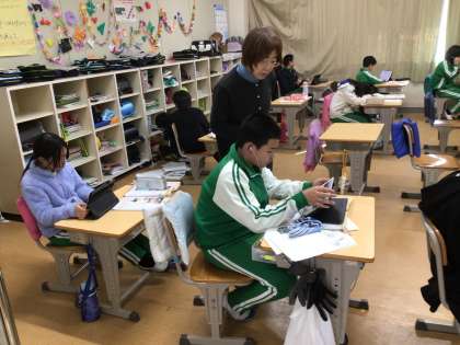 外国語科の時間です。学習用タブレットにイヤホンをつないで聞き取りの問題に取り組んでいます。その間に1人ずつALTとスピーチのテストをしていました。