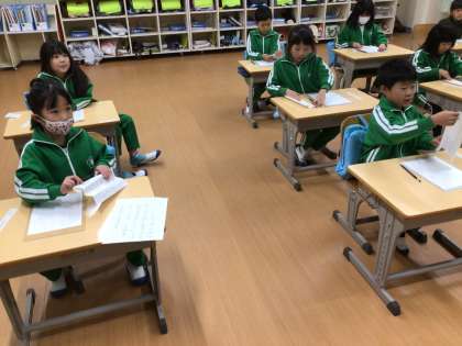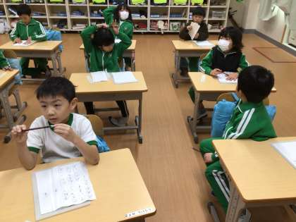 書写の時間です。書き初め練習の1回目でした。1行ずつ、一文字ずつ丁寧に時間をかけて練習していました。