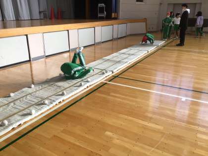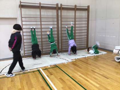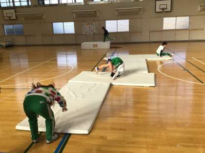 保健体育科の時間です。マット運動の単元でサーキットトレーニングに取り組んでいました。どの子も意欲的に運動していました。