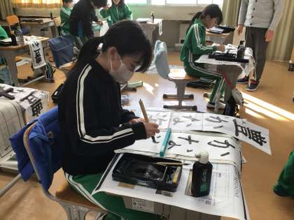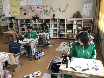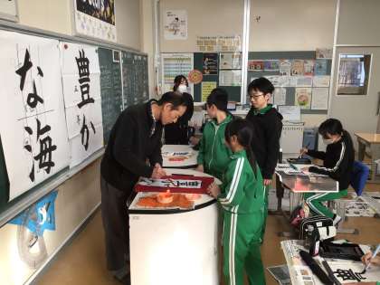 豊田市書道連盟から講師の方に来ていただき、書き初めの指導をしてもらっています。今週と来週の2回に渡って、3年生から6年生まで毎回1時間ずつ教えていただきます。上達のためのよい機会になると思います。