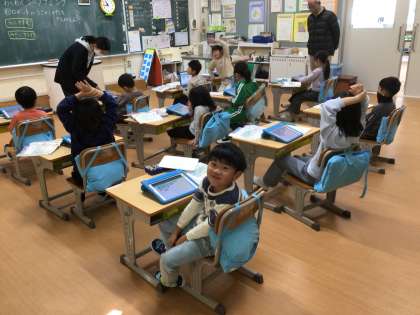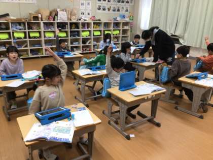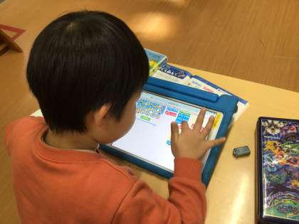 プログラミング学習をしていました。いくつかの命令を組み合わせて指定された枠にコマを動かすというものです。問題に対してすばやくプログラムを完了できていて驚きました。