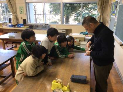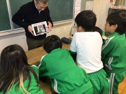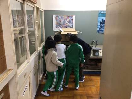 図画工作科の時間です。「いろいろうつして」の続きです。前回までのカレンダーには色をつけ、他の版画には、裏からうすく色付けをしてステンドグラス風にするようです。