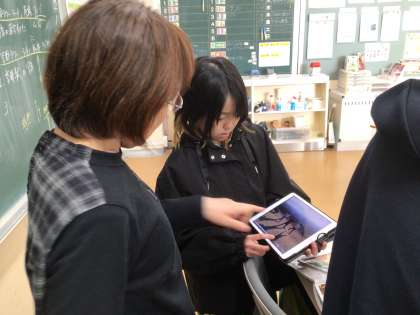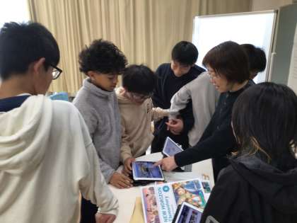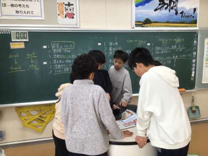 外国語科の時間です。小学校時代の思い出を振り返る内容でした。教室に行った時は先週の修学旅行について各自がタブレットで写した画像を示しながら話していました。