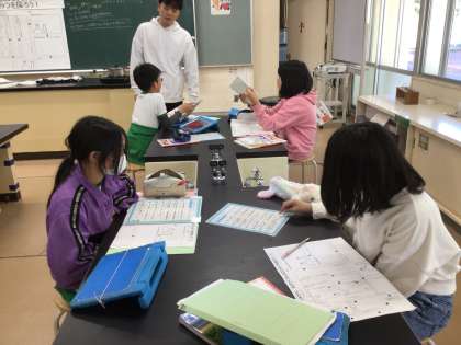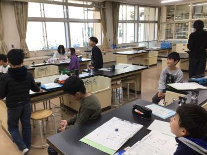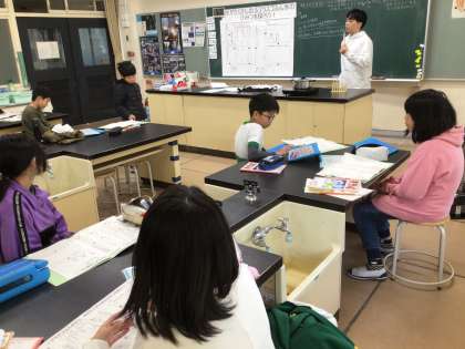 理科の時間です。前回の実験をもとにして、よりたくさんの水が出てくるようにするにはどうしたらよいかを考えていました。子どもたちの発言から次の課題が見つかったようです。