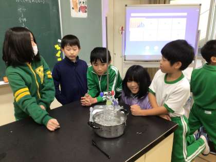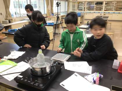 理科の時間です。試験管いっぱいの水を温めた場合と冷やした場合の変化を確かめる実験をしていました。ふくらむ、へこむ、変化なしという予想が出ていましたが、結果はどうでしょうか?