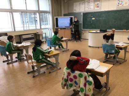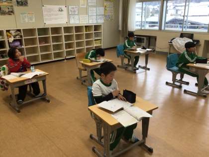 算数科の時間です。分数の学習でした。容器に入っている水のかさを分数で表す問題に向かっています。しっかりと分数の基礎をおさえておきたいですね。
