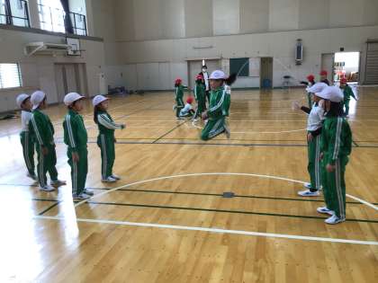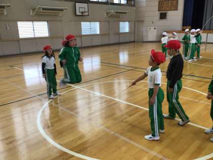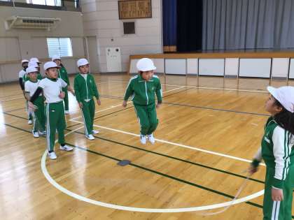 保健体育科の時間です。大縄跳びの練習をしているところでした。赤白に分かれての練習でしたが、以前と比べてとてもスムーズに流れていました。上達した証ですね。