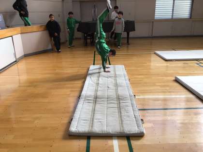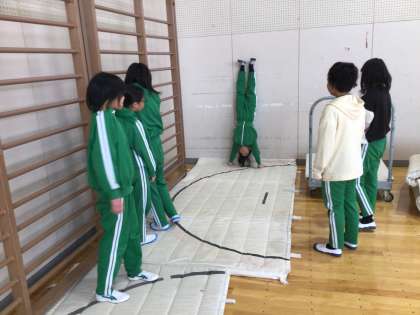 保健体育科の時間です。器械運動の時間でした。いくつかの場所に分かれて倒立や開脚前転、ロンダートなどの技に挑戦していました。もう少しで完成という子もたくさんいます。