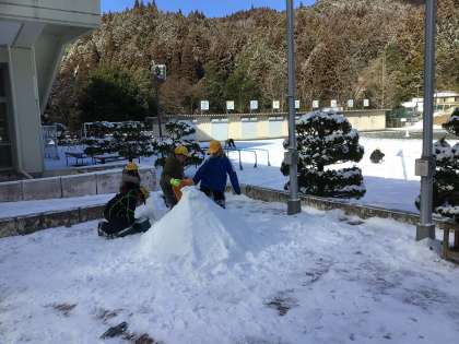 2限後の放課の運動場での様子です。朝は一面白かったものがかなり溶けてしまいました。それでも子どもたちは雪遊びを楽しんでいました。